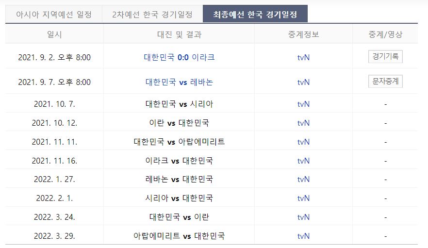 | 한국팀 월드컵 예선 경기 일정 : 레바논 피파랭킹, 상대전적 (0) | 2021.09.06 |